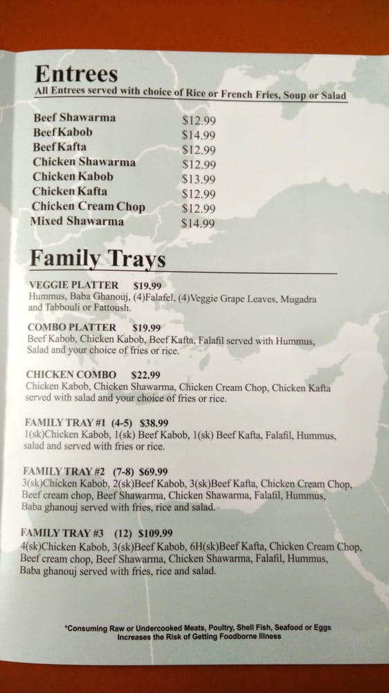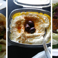 Beef kabob, chicken kabob, beef kafta, falafil served with hummus, salad and rice.